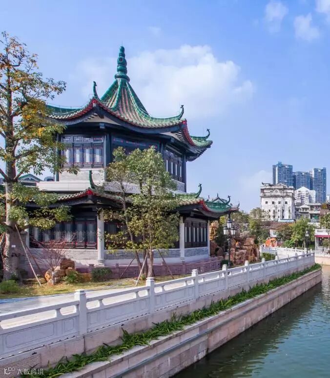 典型的岭南风格建筑,连廊尖角的亭台楼阁