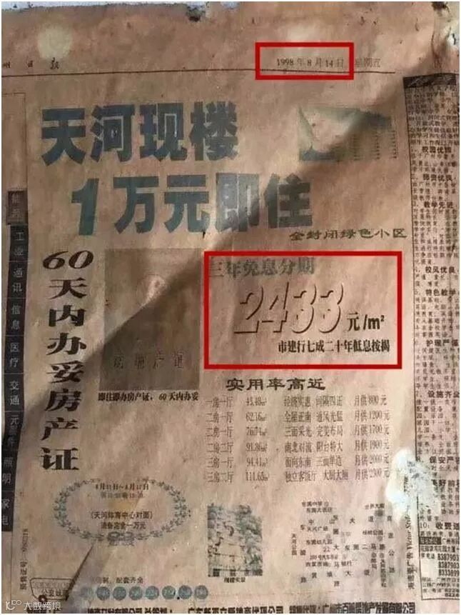 1998年,天河区体育中心对面的一手现楼,单价2433元/m²。同样是在 1998年前后竣工的体育东小区,当前安居客最新报价是47396元/m²。21年间,房屋增值18.5倍!
