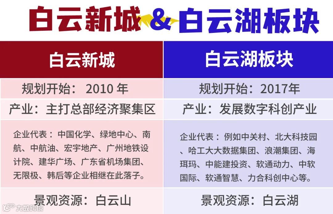 投资额的对比,可见政府对于发展白云的支持力度和决心。而发展白云,重心绕不过两个板块:白云新城和白云湖数字科技城。一个是大城已成,一个是后起之秀。