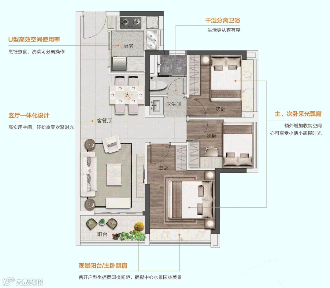 方正实用、明厨明卫;竖厅设计,动静分区;三个卧室都自带大飘窗,采光通风没有问题。