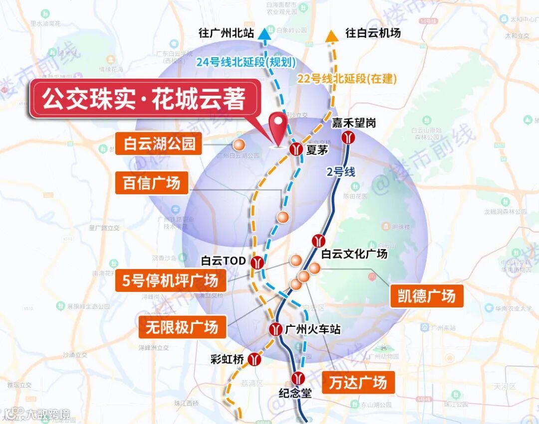 公交珠实·花城云著,22/24号线双地铁上盖(22号线北延段在建,24号线规划中),距离出入口仅约20米,以便捷的交通,方便着住在这里的每个人。
