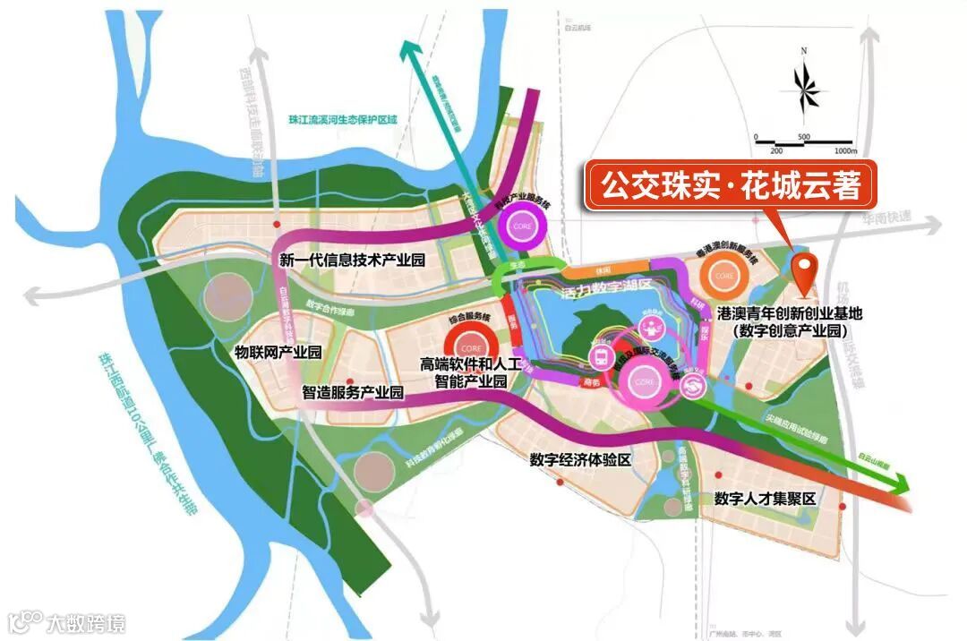 公交珠实·花城云著择址于白云新城、白云湖数字科技城交汇之处。