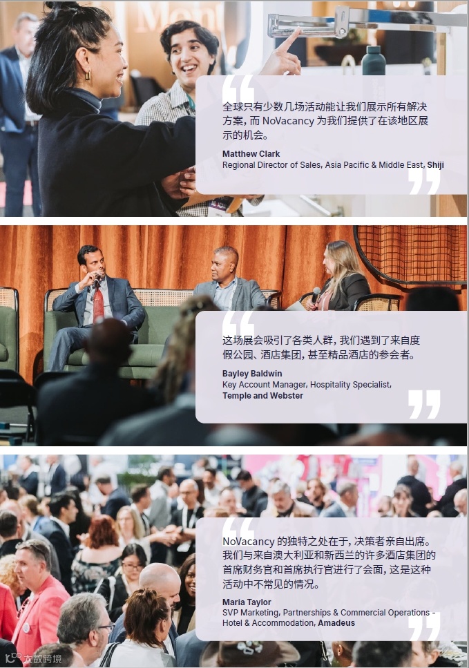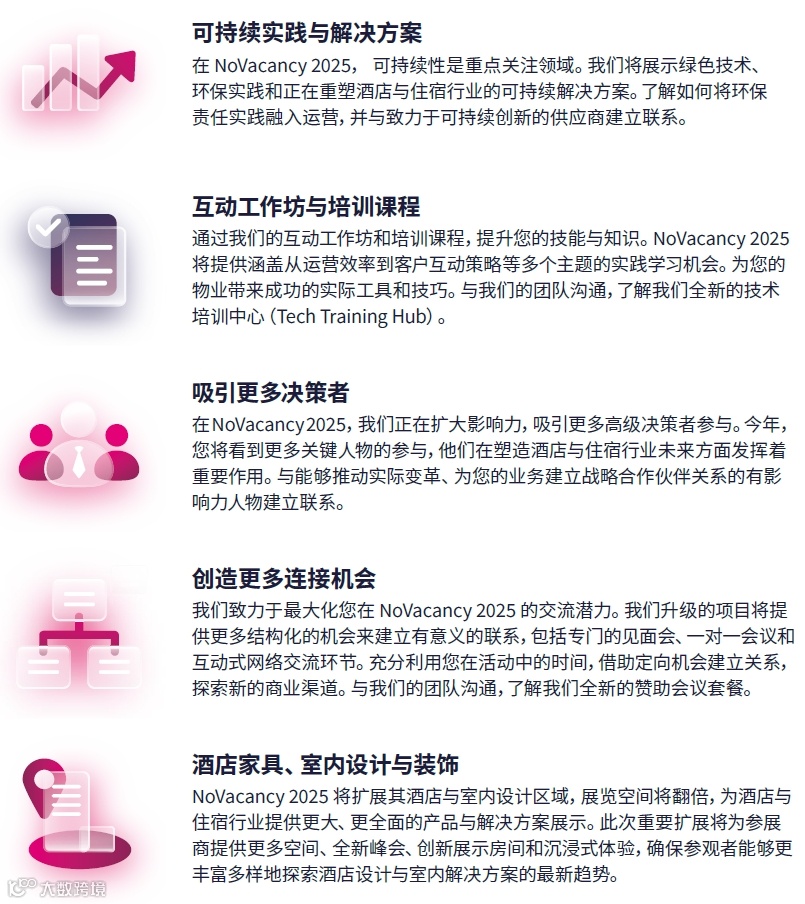 这里不仅是展示平台,更是驱动行业变革的引擎——酒店运营商、资产管理精英、科技先锋、新兴创企、资本力量与思想领袖在此深度碰撞,共同勾勒住宿业的未来图景。无论您是寻求产业升级的行业决策者,还是怀抱颠覆性技术的创新者,NoVacancy都将为您提供: