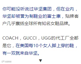 虽然鞋烧了,但这种诚信的品质也成了华坚最好的金字招牌。从1999年起,华坚不断扩张,直至成为中国最大的女鞋制造企业。