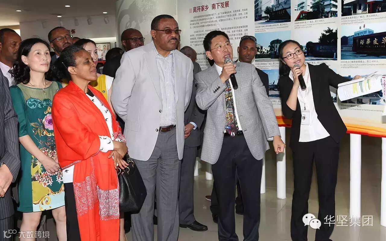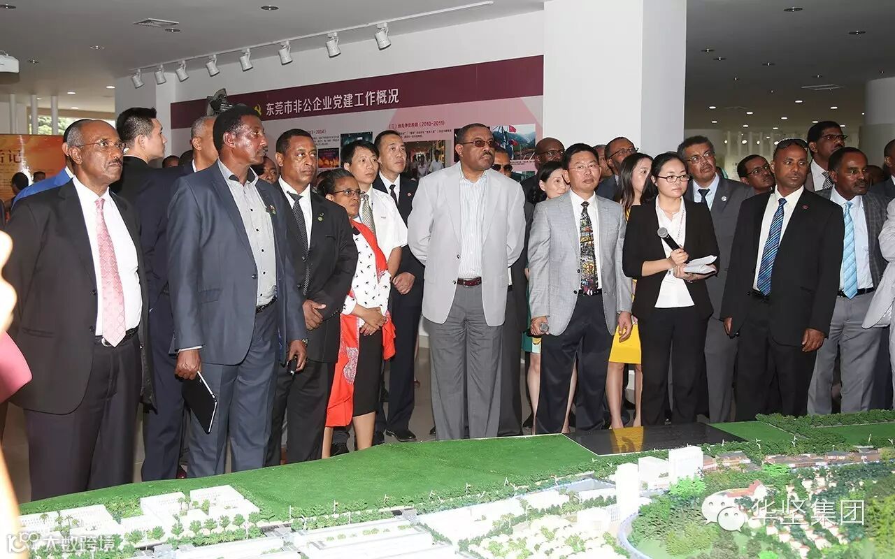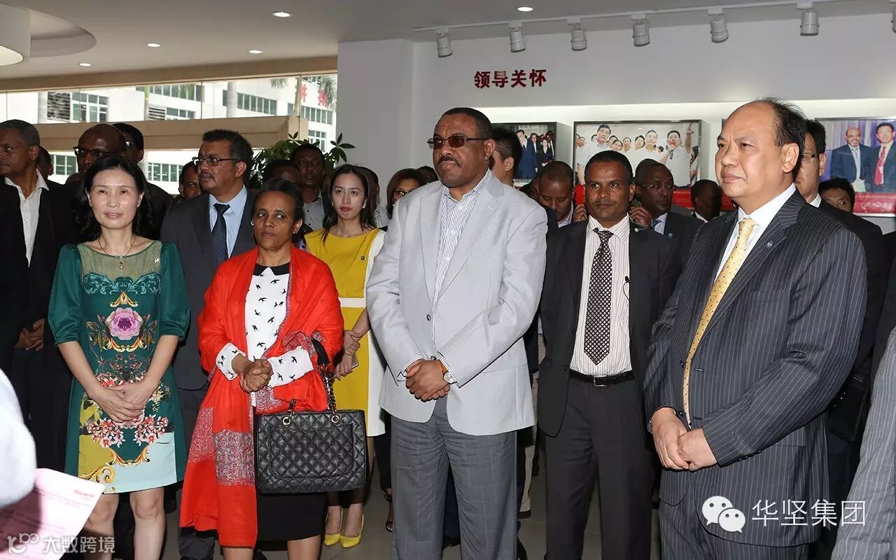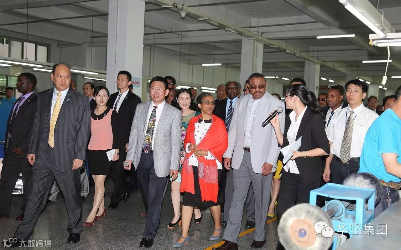 9月8日,埃塞俄比亚总理海尔马里亚姆•德萨莱尼及夫人率领埃塞俄比亚外交部、财政经济发展部、农业部、工业部、矿业部等参观考察华坚集团,出席埃塞俄比亚——(中国)东莞投资合作论坛,并见证华坚集团与进驻埃塞俄比亚的16家企业代表签订合作意向。