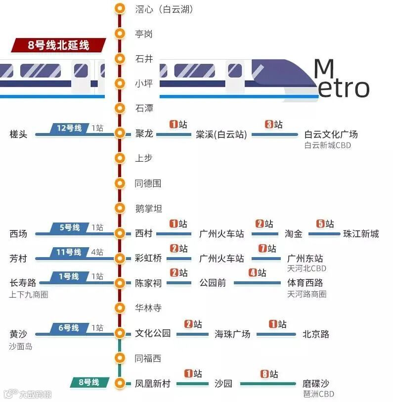 另外,称为“换乘之王”的地铁8号线,可换乘13条地铁线路。从云湖出发,一路直抵荔湾、海珠,最多一线换乘,就可抵达珠江新城、金融城、琶洲等地。