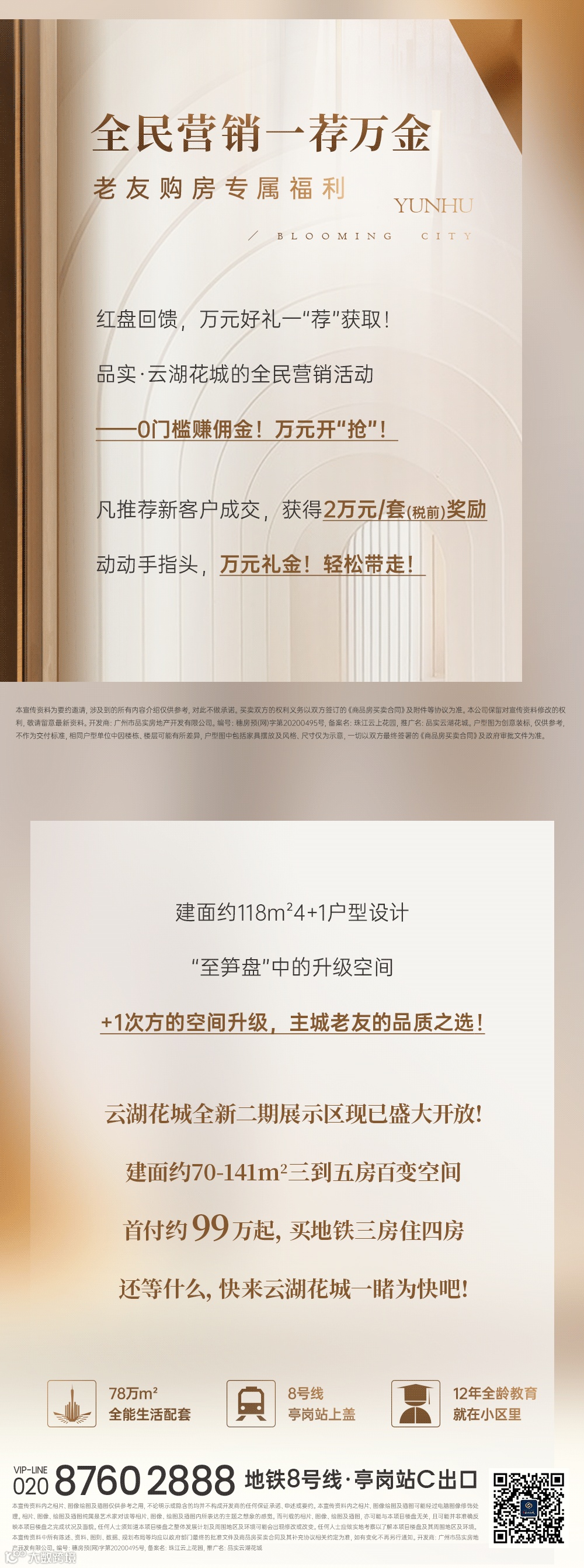 本宣传资料内之相片、图像绘图及插图仅供参考之用,不论明示或隐含的均并不构成开发商的任何保证承诺、申述或要约。本宣传资料内之相片、图像绘图及插图可能经过电脑图像修饰处理。相片、图像、绘图及插图纯属是艺术家对该等相片、图像、绘图及插图内所表达的主题之想象的感觉。而刊载的相片、图像、绘图及插图,亦可能与本项目楼盘无关,且可能并非准确反映本项目楼盘之完成状况及面貌。任何人士须知道本项目楼盘之整体发展计划及周围地区及环境可能会出现修改或改变。任何人士应做实地考察以了解本项目楼盘及其周围地区及环境。本宣传资料中所有陈述、资料、图则、数据、规划布局等均应以政府部门最终的批准文件及商品房买卖合同及其补充协议相关约定为准,如有变化不再另行通知。开发商:广州市品实房地产开发有限公司。编号:穗房预(网)字第20200495号,备案名:珠江云上花园,推广名 :品实云湖花城