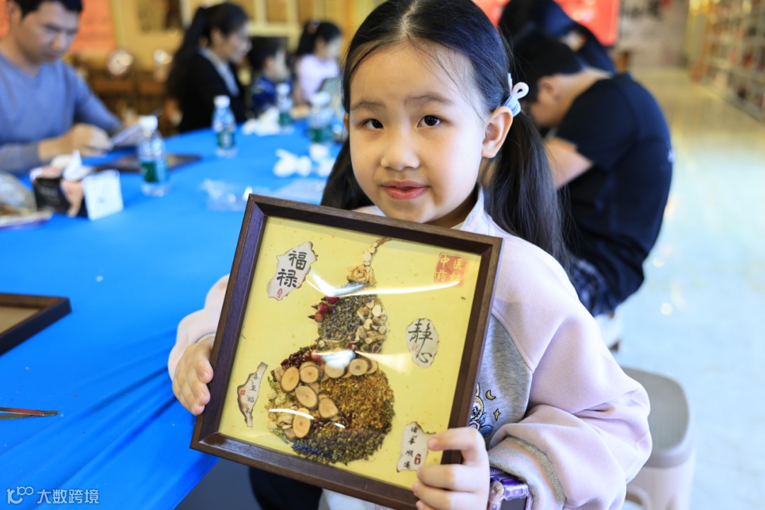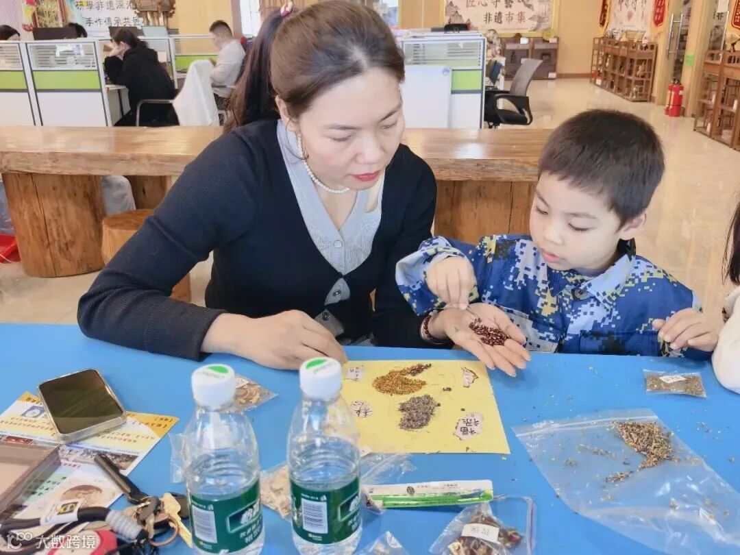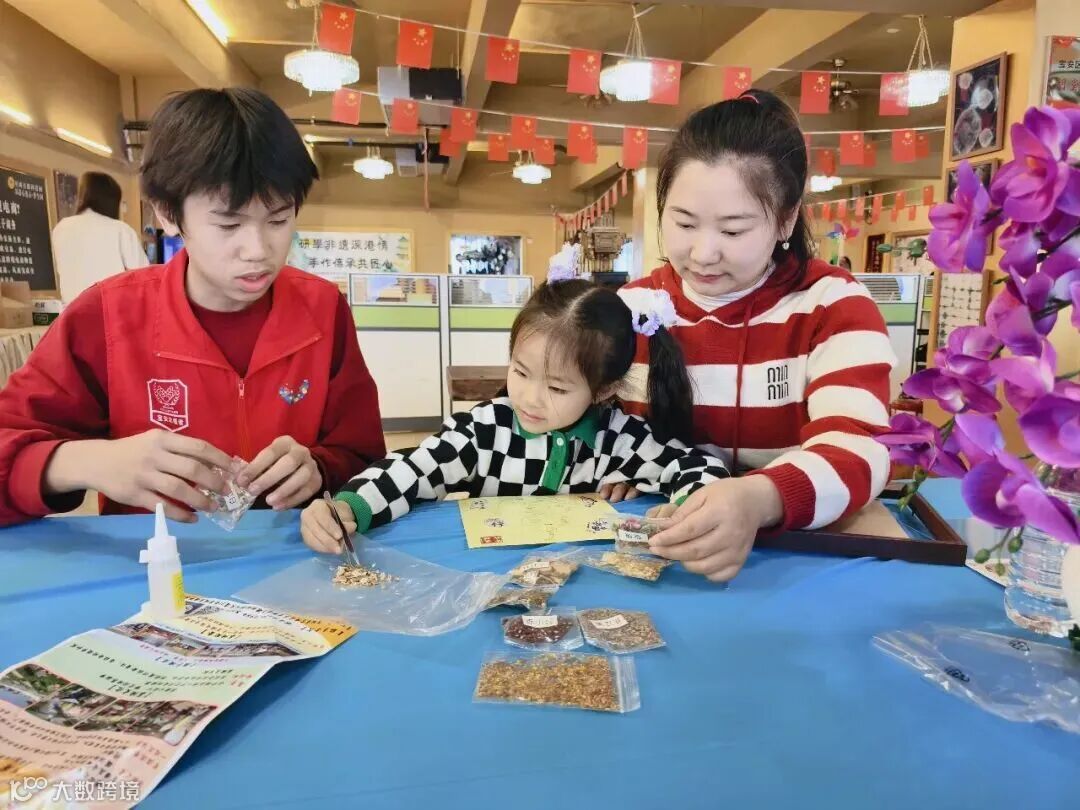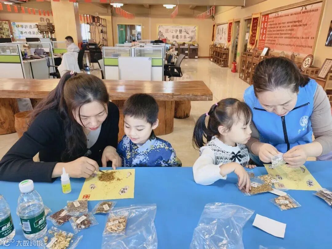 活动现场,基地邢小姐介绍过往成果,并带领亲子家庭参观三楼直播间与四楼户外打卡基地。在二楼非遗博物馆,黄老师引导参观非遗展品,亳州中药世家非遗传承师闫小晴科普中医药文化,趣味亲子问答环节点燃现场氛围。中药拼贴画制作环节中,亲子默契配合、温馨互动,活动后大家手持作品合影点赞。
