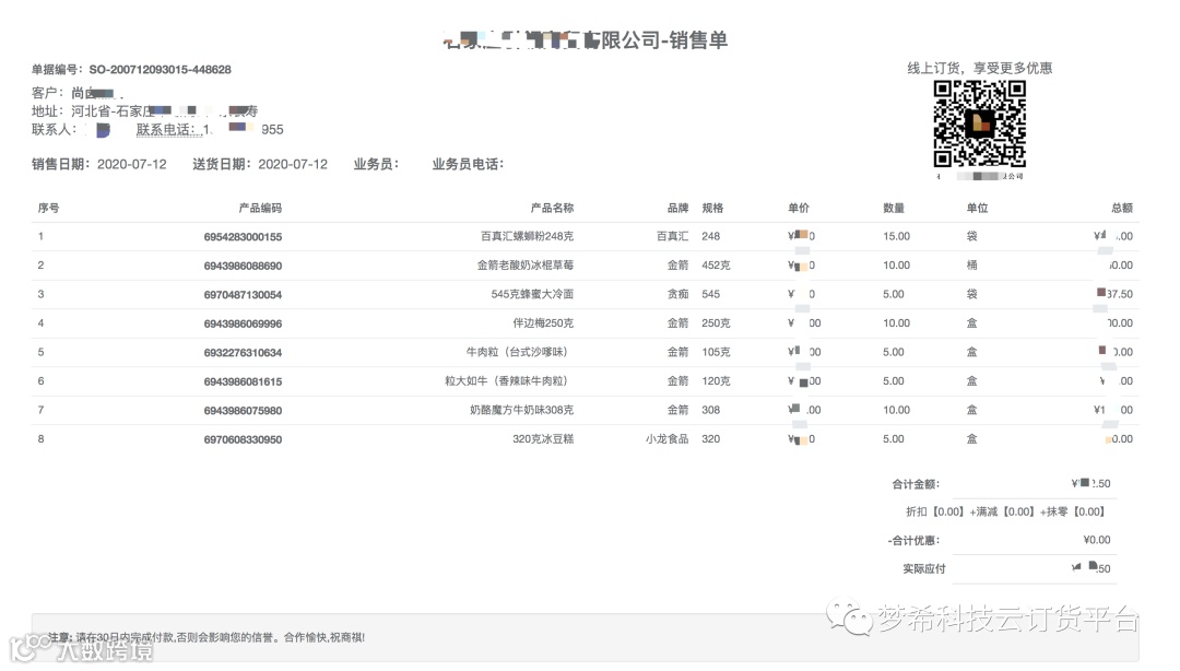 销售单附加订货二维码,方便客户线上下单,让您的店铺随处可见,随处可进!!