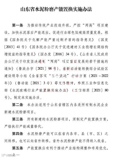 为认真贯彻落实《山东省人民政府办公厅关于印发坚决遇制“两高” 项目盲目发展的若干措施的通知》(鲁政办宇〔2021〕98 号)、省新旧动能转换综合试验区建设领导小组《全省落实“三个坚决” 行动方案 (2021-2022 年)》(鲁动能 〔2021〕3号)等文件精神,我们研究制定了《山东省水泥粉磨产能置换实施办法》,现印发给你们,请认真遵照执行。