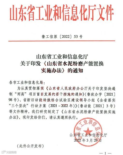 山东省信息工业和信息化厅关于印发《山东省水泥粉磨产能置换实施办法》的通知