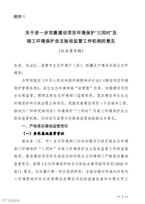 附件:1.《关于进一步完善建设项目环境保护“三同时”及竣工环境保护自主验收监管工作机制的意见(征求意见稿)》