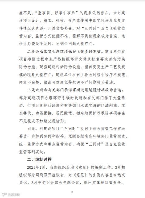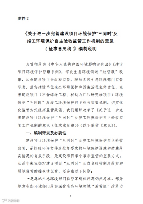 2.《关于进一步完善建设项目环境保护“三同时”及竣工环境保护自主验收监管工作机制的意见(征求意见稿)》编制说明