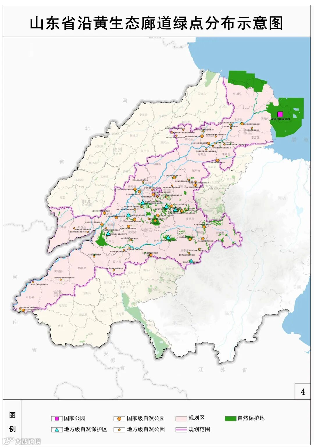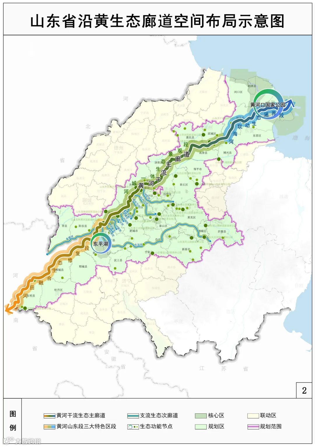 “多点”,即多处生态功能节点。依托自然保护区、自然公园、水利风景区等重要生态节点,合理定位自然保护地主体功能、边界范围,高标准建设黄河口国家公园,高水平提升东平湖生态功能,高质量建设济南大寨山、泰安徂徕山等自然保护区,高品质建设泰山风景名胜区等自然公园和菏泽黄河、济南百里黄河、垦利区黄河口等水利风景区,建立系统完善的自然保护地体系。