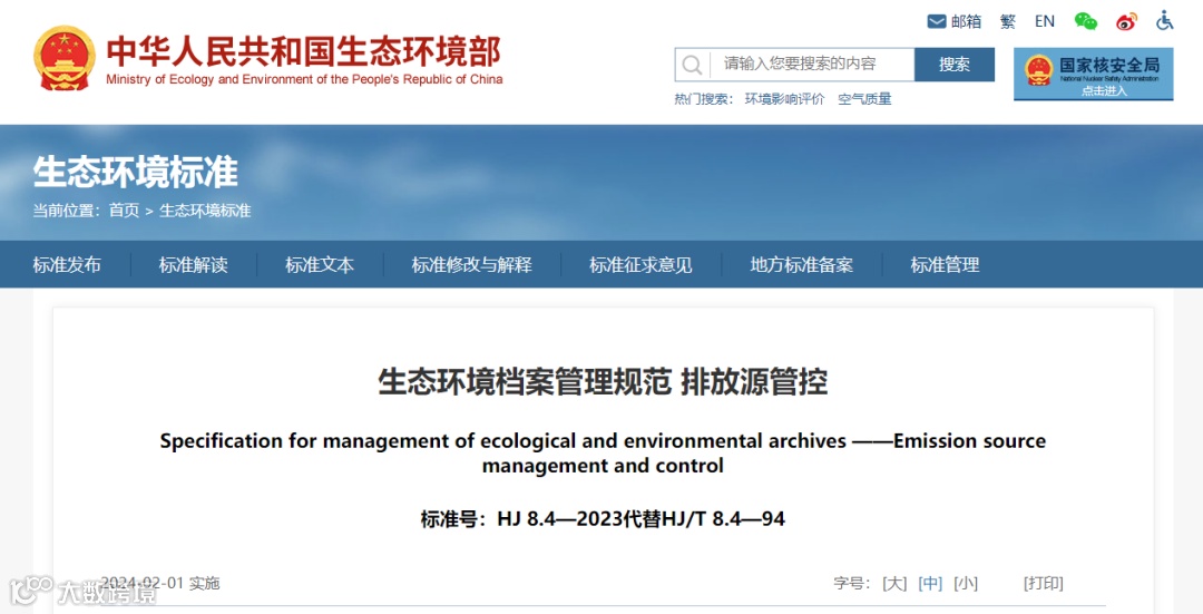 以上标准自2024年2月1日起实施,自实施之日起,《环境保护档案管理规范 污染源》(HJ/T 8.4-94)废止。