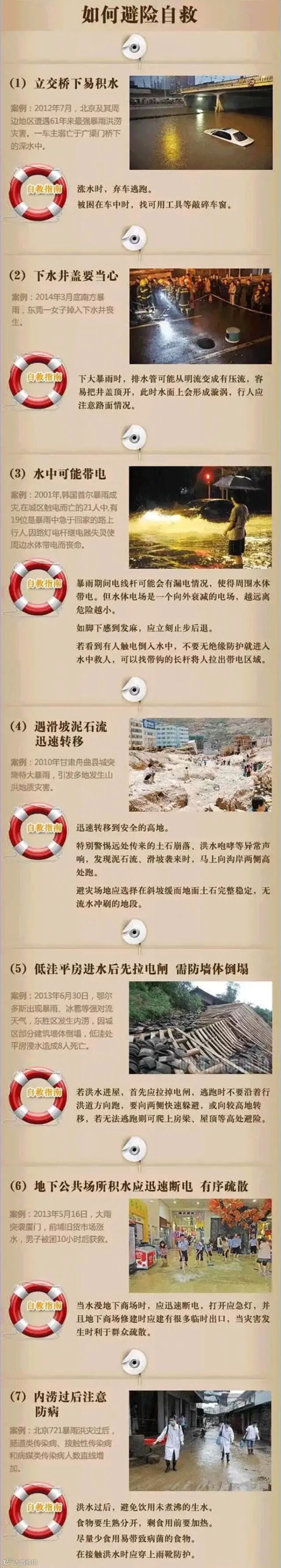 ✰行走时也要尽量避开灯杆、电线杆、变压器、电力线、铁栏杆及附近的树木等有可能连电的物体,以防因为暴雨导致漏电之后触电;发现有电线落入水中, 必须绕行并及时报告相关部门。