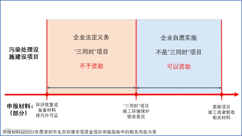 竣工环境保护验收是区分项目是否为“环保三同时”项目的时间节点。竣工环境保护验收前开展的项目均属于“环保三同时”项目,不属于市生态环境专项资金资助范围。竣工环境保护验收后开展的项目,属于企业在达标排放的基础上自愿实施的污染处理设施更新(或提标)项目,可按照《2022年度深圳市生态环境专项资金项目申报指南》申报项目。