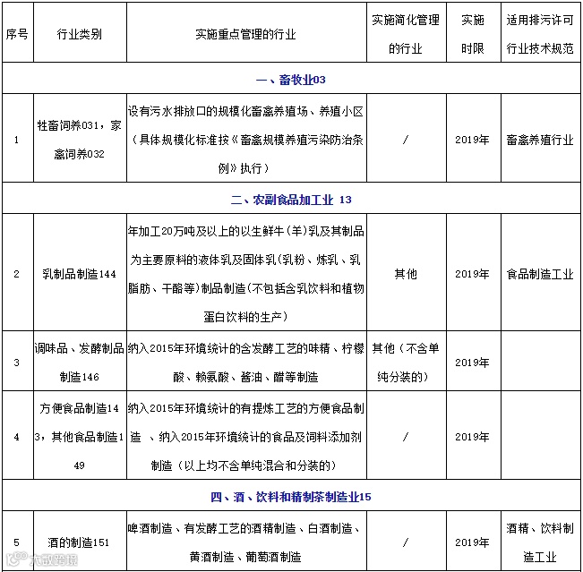 根据《固定污染源排污许可分类管理名录2017》(部令 第45号)要求,农副食品加工业、酒、饮料和精制茶制造业、家具制造业、水的生产和供应业等十九个行业,