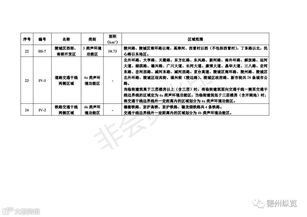 本次区划调整在德州市中心城区已明确用地性质的区域内划分1类标准适用区域5个,2类标准适用区域10个,3类标准适用区域7个,4类标准适用区域城市公路28条、铁路4条,调整后声环境功能区面积为322.14km2,城市规划中未明确用地性质的区域暂不纳入声环境功能区范围内。