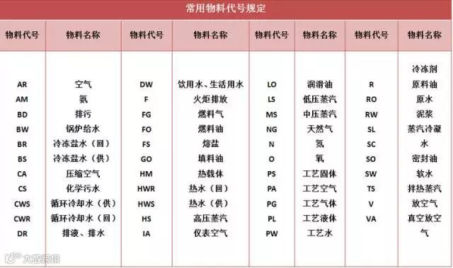 第一组有三个单元,分别为物料代号、主项编号及管道顺序号。其中第1单元为物料代号,由1~3位英文字母表示,各种物料代号见下表,表中未规定的物料代号的由专业技术人员按英文字母选取。