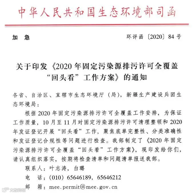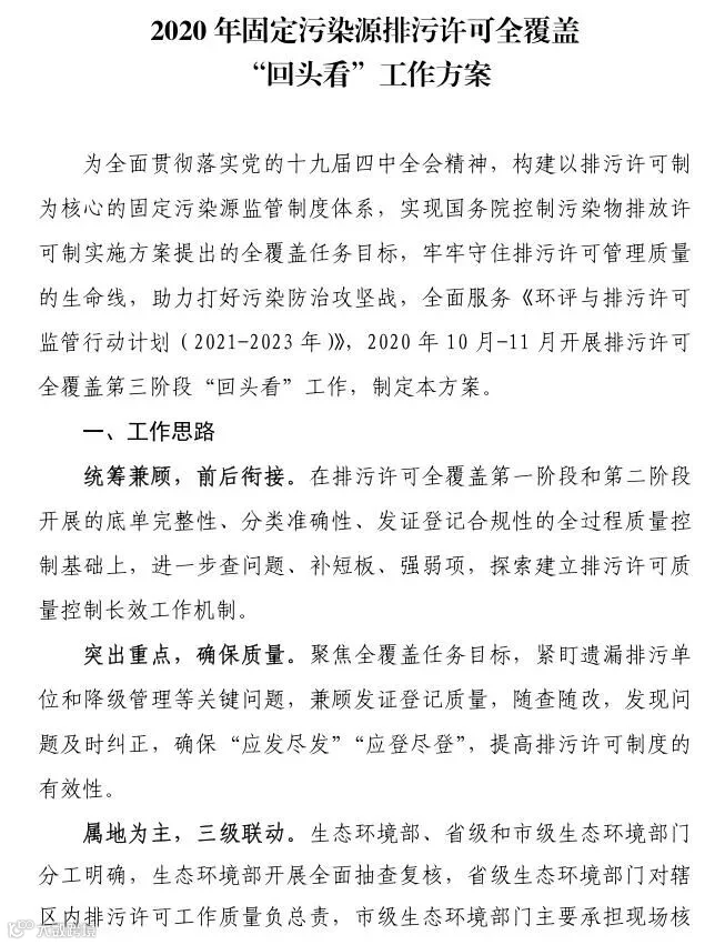《2020年固定污染源排污许可全覆盖“回头看”工作方案》部分内容要点如下: