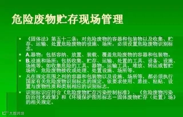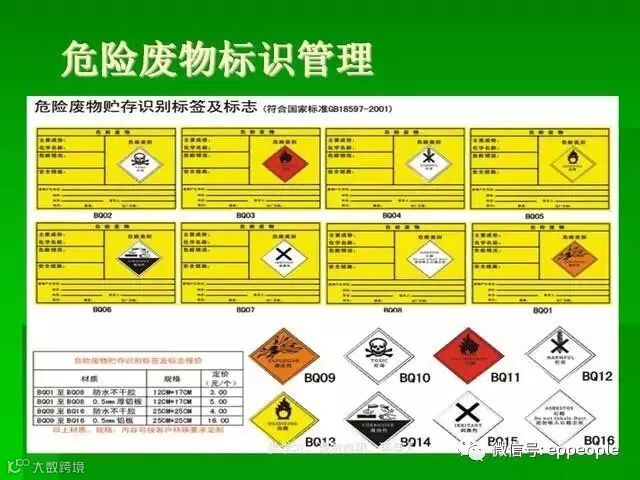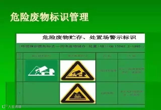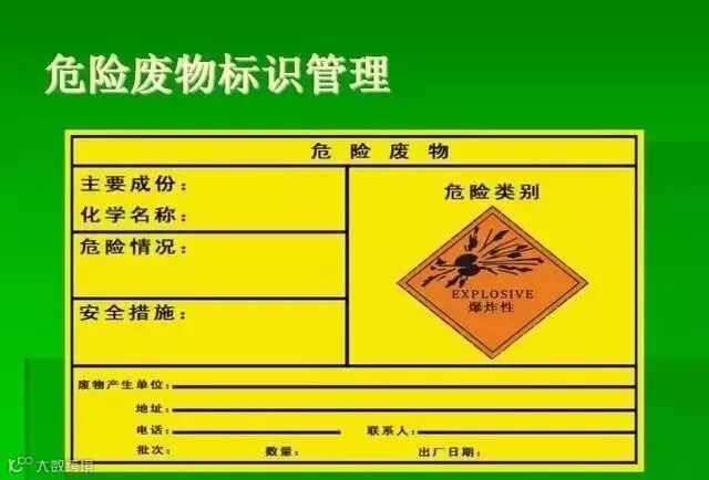危险废物识别标志设置不规范或不设置。关于标志或标签国际是有规定的,详见:《环境保护图形标志》(GB 15562.2)、《危险废物贮存污染控制标准》(GB 18597)危险废物仓库门外的警告标志长这样的啦~