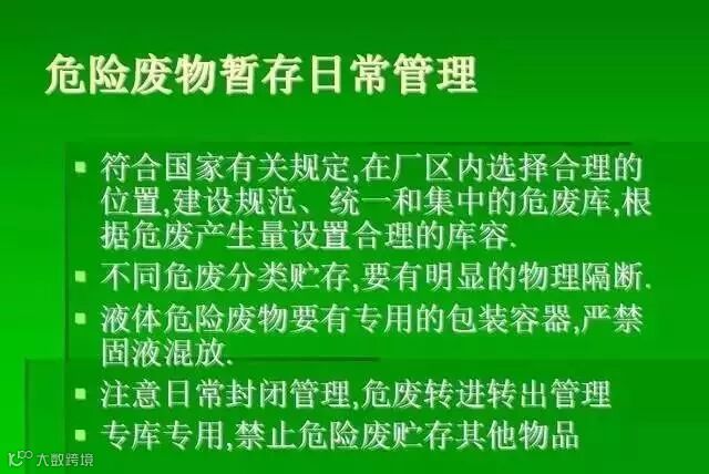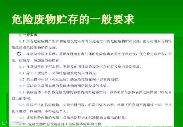 危险废物储存不规范。危险废物的储存是有国家标准的,即《危险废物贮存污染控制标准》(GB 18597-2001)。产生危险废物的单位应具备专门危险废物贮存设施和容器企业应建造专用的危险废物贮存设施,也可利用原有构筑物改建成危险废物贮存设施。除常温常压下不水解、不挥发的固体危险废物之外,企业必须将危险废物装入符合标准的容器。收集、贮存的方式和时间应符合要求企业必须按照危险废物特性分类进行收集和贮存,也必须采取防止污染环境的措施。禁止混合收集、贮存性质不相容而未经安全性处置的危险废物。禁止将危险废物混入非危险废物中贮存(要注意哦,不能将危险废物储存或丢弃到一般生活垃圾堆场)。