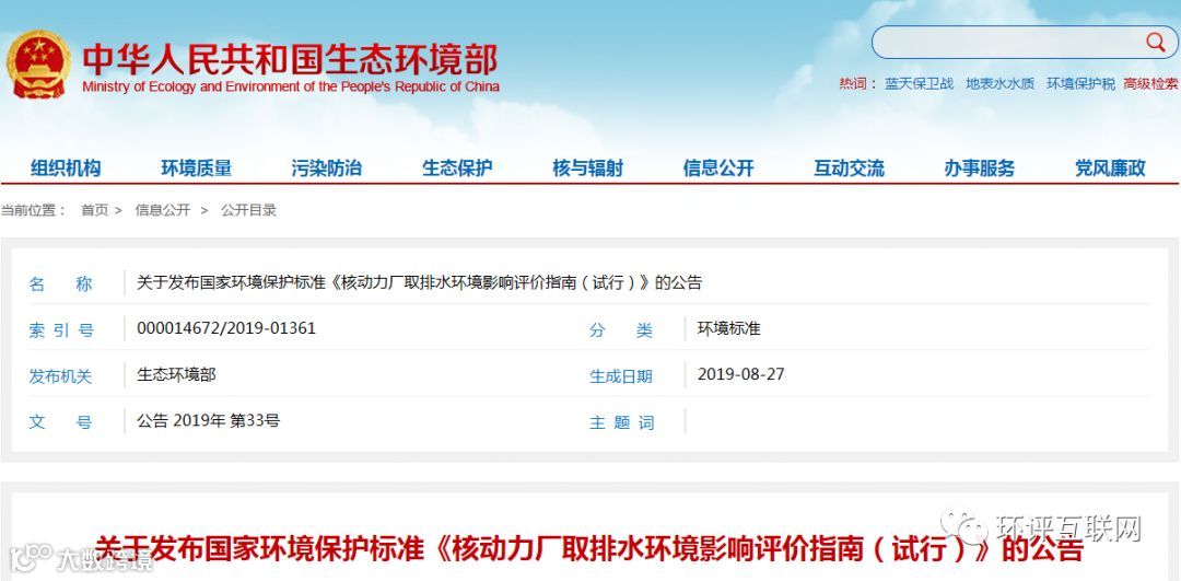 为贯彻《中华人民共和国环境保护法》《中华人民共和国水污染防治法》《中华人民共和国海洋环境保护法》和《中华人民共和国环境影响评价法》,规范核动力厂建设项目取排水环境影响评价工作,现批准《核动力厂取排水环境影响评价指南(试行)》为国家环境保护标准,并予公布。