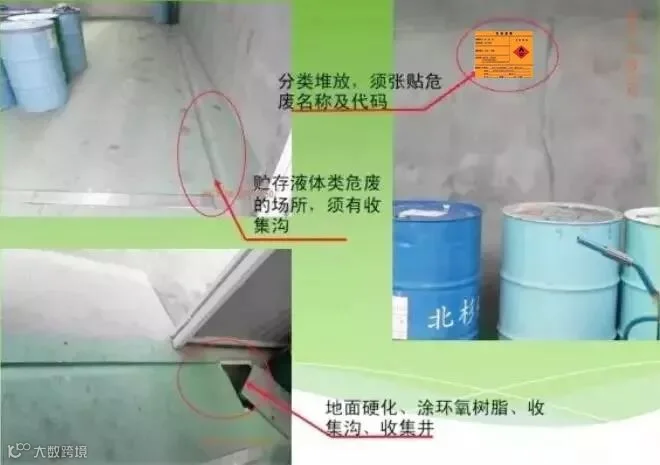 贮存场所地面须硬化处理,并涂至少2mm密度高的环氧树脂,以防止渗漏和腐蚀。存放液体性危险废物的贮存场所须设计收集沟及收集井,以收集渗滤液,防止外溢流失现象。