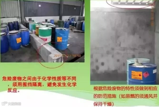 不同种类危险废物应有明显的过道划分,墙上张贴危废名称,液态危废需将成装容器放至防泄漏托盘内并在容器粘贴危险废物标签,固态危废包装需完好无破损并系挂危险废物标签,并安要求填写。