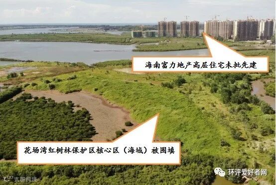 富力公司在开发红树湾房地产项目过程中,不断蚕食侵占海洋保护区,2016年以来该项目填海侵占澄迈县花场湾红树林自然保护区核心区92亩,至今未恢复原状。根据澄迈县有关部门巡查记录,红树湾项目建设过程中先后5次破坏红树林,累计毁坏红树林约4700株。2019年4月,红树湾项目继续在保护区内填海建设楼盘,以致阻碍潮水交互,致使9.69亩保护区范围内的1582株红树林枯死。