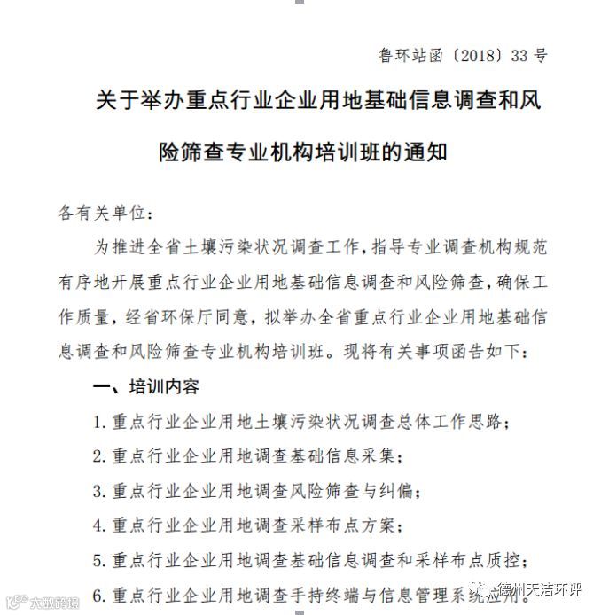 根据《山东省土壤污染状况详查实施方案》(鲁环发[2018]113号)相关要求,山东省将开展省内重点行业企业用地土地污染状况调查工作。根据《山东省环境保护厅关于开展重点行业企业用地基础信息调查专业机构筛选工作的通知》(鲁环函[2018]494号)和《关于举办重点行业企业用地基础信息调查和风险筛查专业机构培训班的通知》(鲁环站函[2018]33号),我单位经省环保厅筛选,为“重点行业企业用地基础信息调查”专业机构,届时派出技术骨干参加培训。