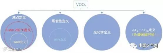 如上提到的各种标准中不同的VOCs 定义是以物质的不同性质来描述的,它们的关系大致如下图所示: