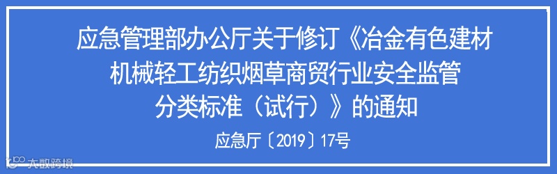 为进一步科学界定冶金等工贸行业范围,依据《国民经济行业分类》(GB/T4754-2017),应急管理部重新修订了《冶金有色建材机械轻工纺织烟草商贸行业安全监管分类标准(试行)》,原《国家安全监管总局办公厅关于印发冶金有色建材机械轻工纺织烟草商贸行业安全监管分类标准(试行)的通知》(安监总厅管四〔2014〕29号)同时废止。
