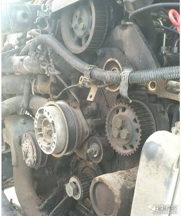 由于依维柯的发动机上方装有空调蒸发器,正时皮带上壳拆卸不便,修理工偷懒在凸轮轴带轮和缸盖上各画了一个位置标记,此时曲轴正时标记点处在垂直向下位置。由于国三索菲姆发动机附件箱(油泵)皮带轮齿数与曲轴带轮齿数不成倍数关系,故不必考虑正时位置。记下标记点后拆除正时皮带和正时带惰轮、涨紧轮更换轴承。