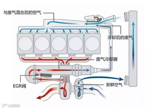 EGR即废气再循环系统,工作原理为一少部分发动机废气通过EGR阀进入气缸内与混合气燃烧,这样做的目的是降低燃烧时的气缸温度,另一方面是为了降低氧气含量。