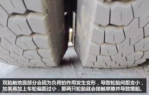 一、双轮胎偏距过小会造成两只轮胎之间的间隙太小,工作时互相接触摩擦生热导致频繁爆胎。