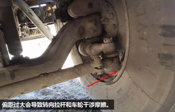 二、偏距过大的车轮装在转向桥上时,车轮边缘会和转向拉杆头部发生干涉摩擦,导致车轮和转向拉杆球头磨损报废,并有可能使拉杆脱落,车辆方向失控。