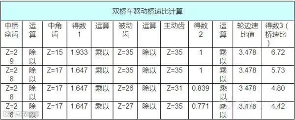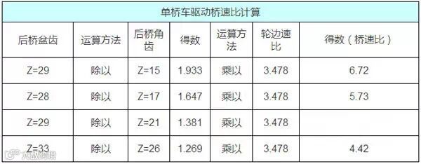 根据车辆用途的不同,目前最常见的速比有6.72、5.73、4.8、4.42四种。这个速比是中央一级减速比与轮边减速速比(3.478)的乘积,而后桥或单桥车是通过后桥盆齿和角齿在调速比,所以改变不同速比的后桥盆角齿既可得到不同的速比值。后桥盆角齿有29/15、28/17、29/21、33/26几种,具体运算方法通过下表来表述一下: