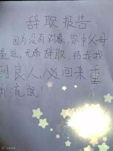 “尊敬的领导,本人因找不到对象等原因请辞,望批。”