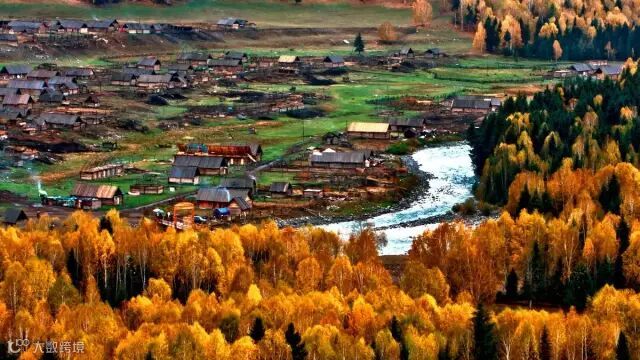 禾木河自东北向西南流淌,原始村落与大草原和谐自然的融为一体