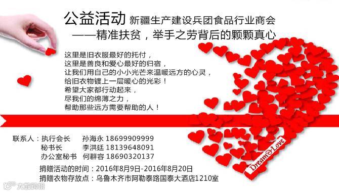 不是每个人都有高收入,不是每个人都有很多的存款,不是每个人都能够盖起一座希望小学,但每个人可以把自己不需要的旧衣物转送给那些需要它们的人,举手之劳的背后是一颗颗温暖的心。在这里,新疆生产建设兵团食品行业商会号召全体社会人群捐赠衣物,献出爱心。
