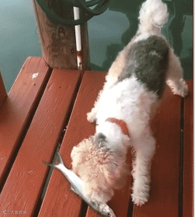 自己家的狗看到一条小鱼就吓傻逼