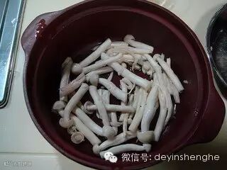 在煮羊肉期间把蘑菇汆烫一下放入砂锅内铺平垫底。