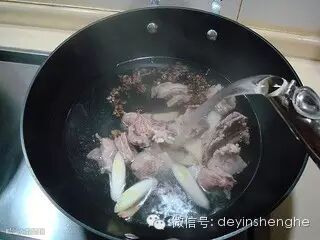 另起锅,放入葱、姜和花椒,然后放入焯好水的羊肉注入开水。