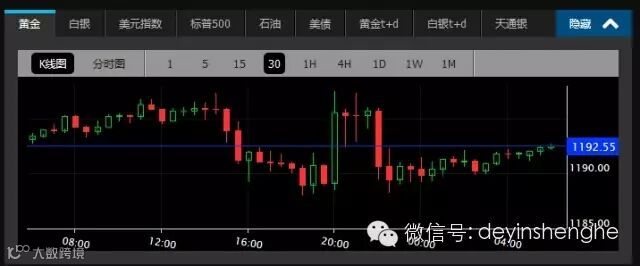 国际现货黄金亚市盘中开于1193.00美元/盎司,欧市开盘后,黄金大幅下挫创日内低点1187.80;北美盘初,因美国4月ADP就业不及预期,黄金反弹最高触及1197.40美元/盎司,但随后回吐所有涨幅收报1191.80美元。