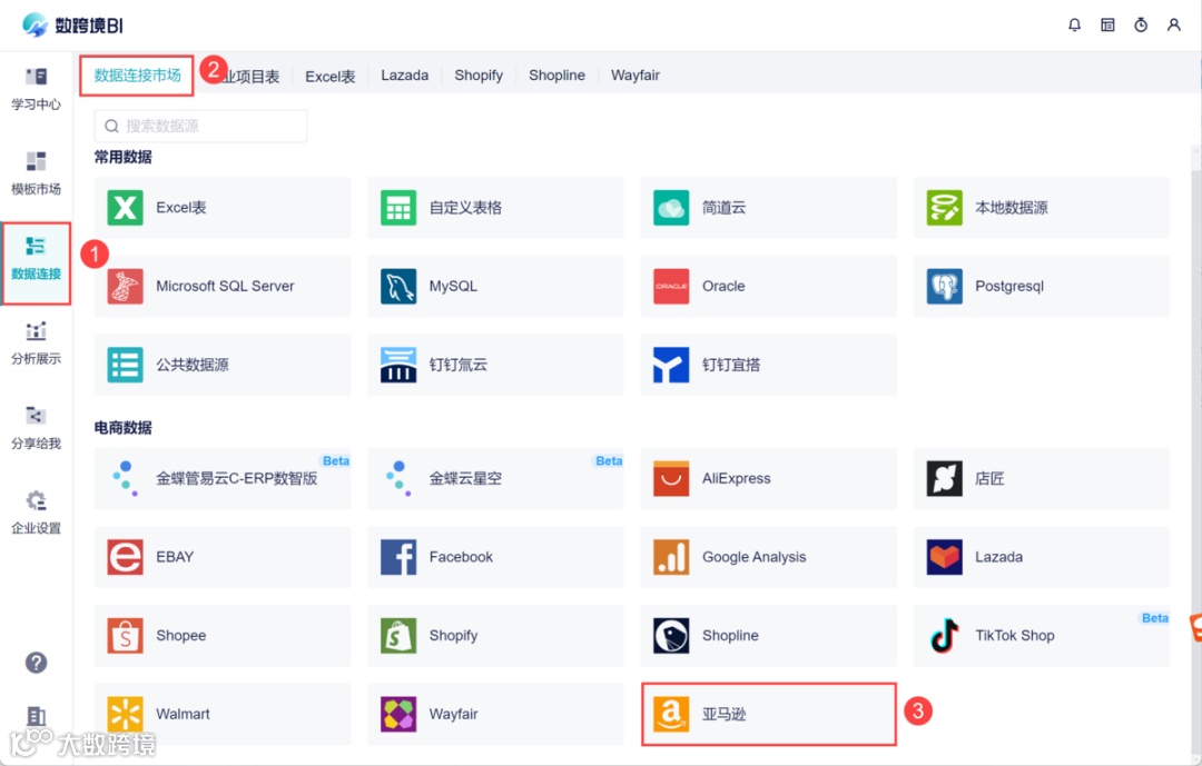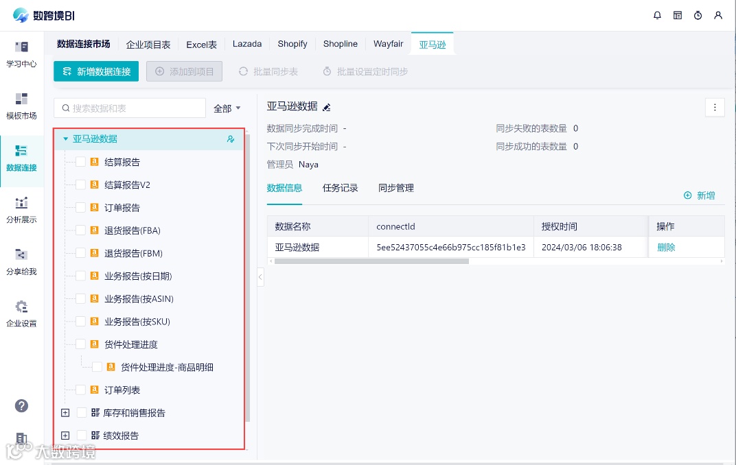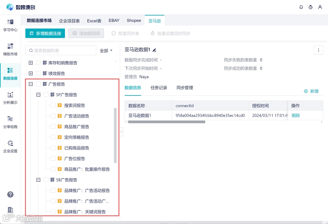 点击新增亚马逊广告授权,进入授权页面;授权后,在左侧数据列表中,就会新增「广告报告」相关的数据表