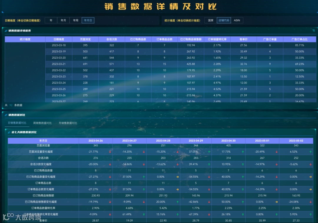 对于跨境运营来说,《每日数据分析看板》是一个非常有价值的工具,能够一目了然地看到店铺产品的各种细分数据,包括每日之间、每周之间、月度之间的数据对比,实时掌握业务动态,帮助产品优化。