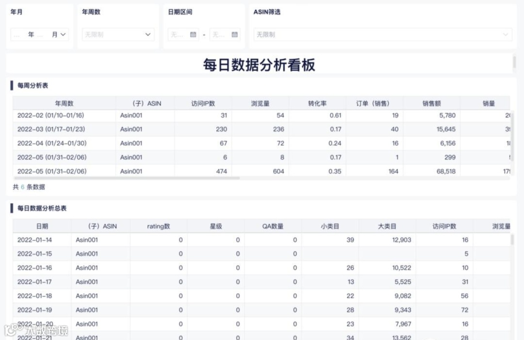 细节设计上,可以在日期、日期区间、ASIN上做筛选下拉框,快速匹配不同时间的特定ASIN数据。