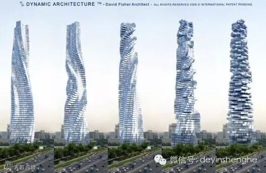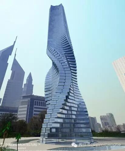 “迪拜旋转塔”高约420米,是80层的综合大楼,20层以下是办公建筑,21层到35层的六星级酒店,36到70层是豪华公寓,最上面10层是别墅。各个楼层之间都安装风力涡轮机,每一层都可以以不同速度独立自由旋转360度。